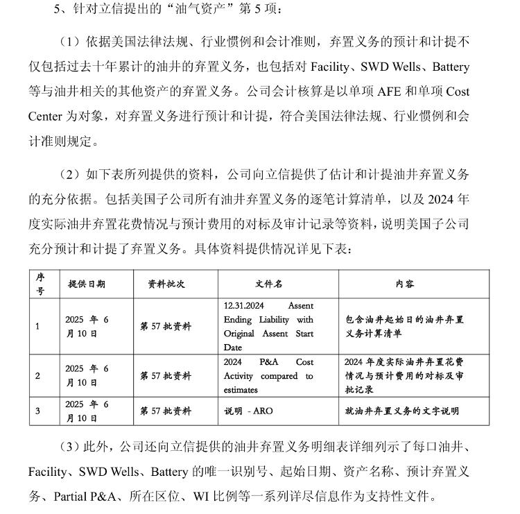 新潮方面表示,在具体的审计过程中,尽管公司提供了符合美国行业惯例、公司管理实际及美国会计准则的油气资产详细清单和台账,其中还包括立信独特要求的、违背美国油气行业惯例的以单井维度提供油气资产清单的内容。但是立信仍未完全认可按照行业惯例、公司管理实际以及历年统一标准下编制的资产清单。并且,过去十年,全球审计排名前十、美国排名前八的专业机构Forvis Mazars,一直对ST新潮美国子公司出具标准无保留意见。此外,针对公司2024年油气资产的专项审计报告同样结论清晰,成功获得标准无保留意见,然而,也尚未得到立信认可。