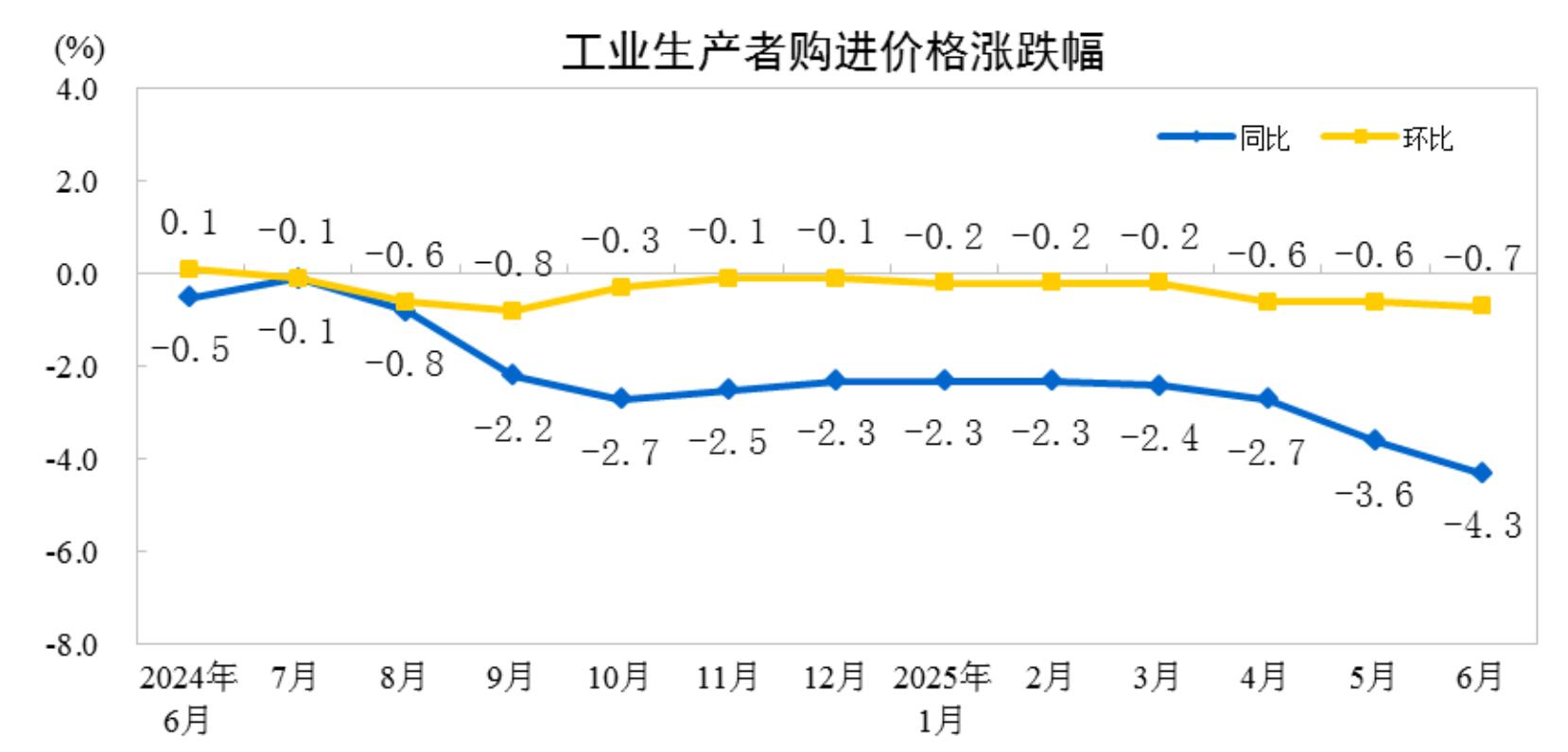 2025年6月份,全国工业生产者出厂价格同比下降3.6%,环比下降0.4%;工业生产者购进价格同比下降4.3%,环比下降0.7%。上半年,工业生产者出厂价格比上年同期下降2.8%,工业生产者购进价格下降2.9%。