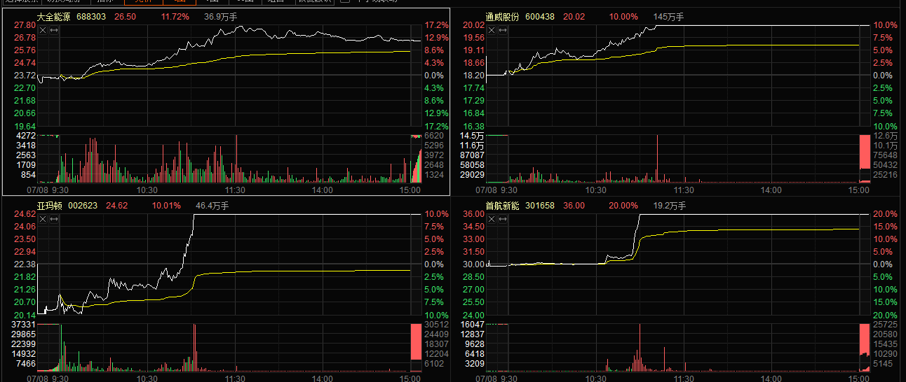 《科创板日报》7月8日讯(编辑 宋子乔) 今日光伏概念股再度走强,截至收盘,核心标的通威股份涨停,大全能源涨超11%,亚玛顿上演“地天板”,次新股首航新能20CM涨停,拓日新能、亿晶光电、欧晶科技、钧达股份、凯盛新能、双良节能等多只个股涨停。