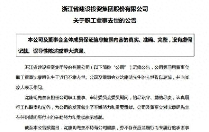 浙江省建设投资集团股份有限公司(下称“浙江建投”)(002761.SZ)于7月3日公告称,集团职工董事沈康明于近日不幸去世,年仅54岁。