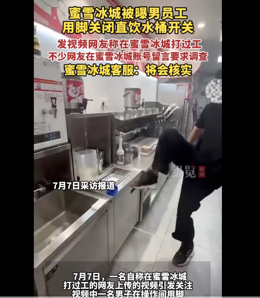 7月7日,一名自称在蜜雪冰城打过工的网友发布的视频引发关注,视频中一名男子在操作间内用脚踢向直饮水桶水龙头尝试关闭。视频引发网友转发和不满,有不少网友纷纷在蜜雪冰城多个官方账号进行留言,要求蜜雪冰城给一个说法。