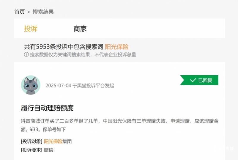 根据7月7日黑猫投诉平台数据显示,共有5954条投诉中包含关键词“阳光保险”,939条投诉中包含关键词阳光财险,701条投诉中包含关键词阳光人寿。