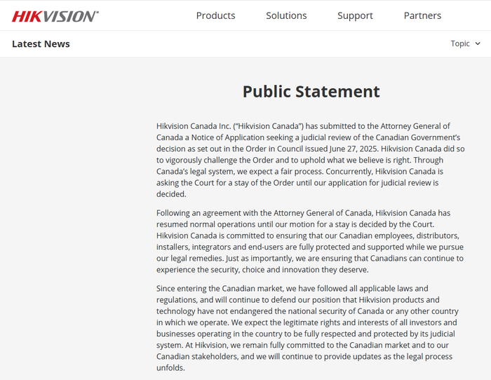 海康威视表示,自进入加拿大市场以来,遵守所有适用的法律和法规,公司将继续捍卫其立场,即海康威视的产品和技术没有危及加拿大或公司运营所在的任何其他国家/地区的国家安全。