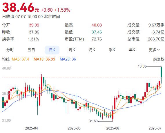 7月7日,三棵树收涨1.58%,每股报38.46元,总市值为283.76亿元。