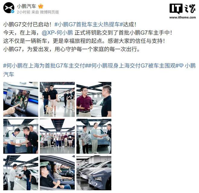IT之家 7 月 7 日消息,小鹏汽车今日宣布小鹏 G7 交付已启动,董事长何小鹏正式将钥匙交到了首批小鹏 G7 车主手中。