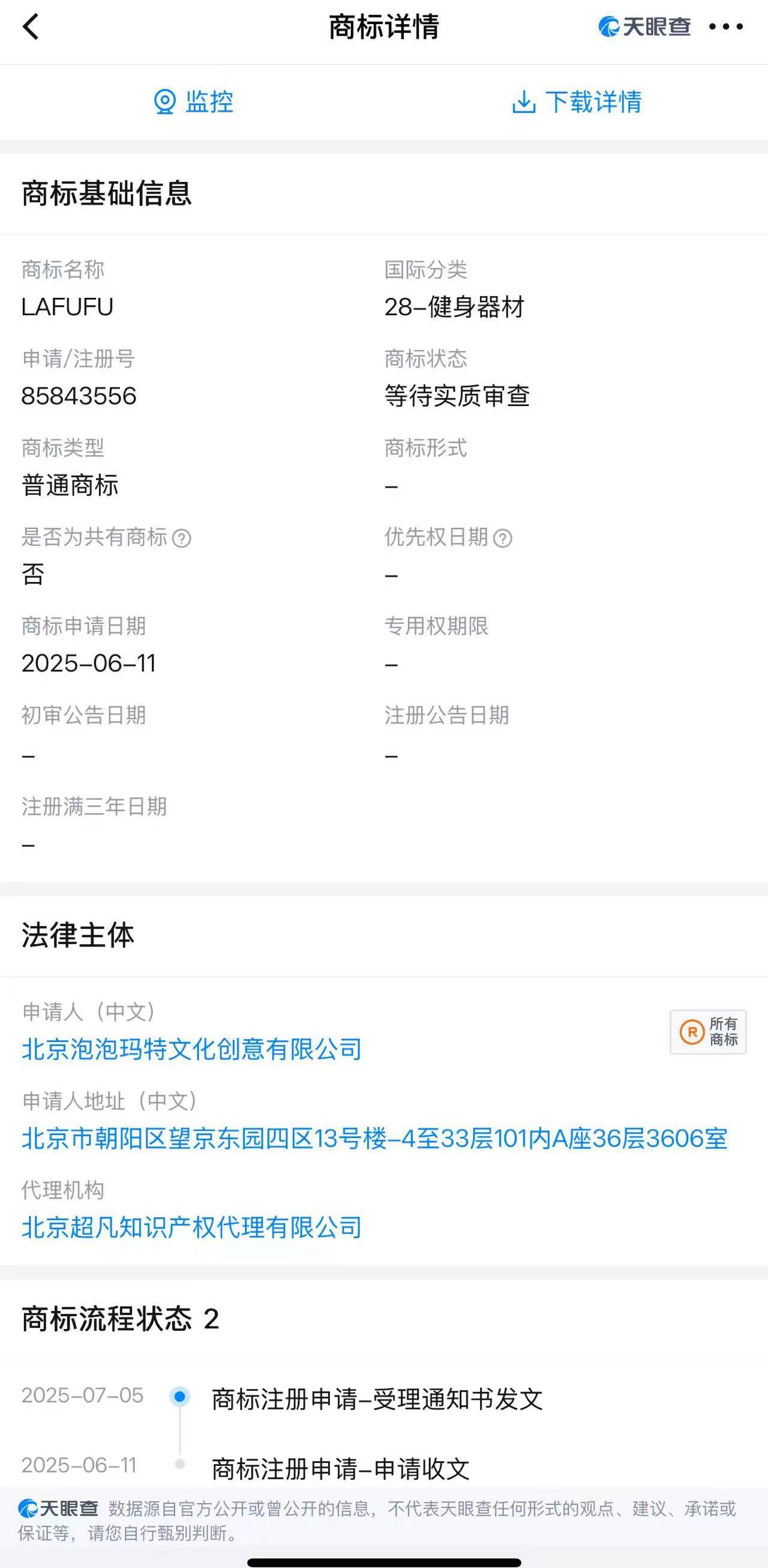 7月7日,天眼查商标查询信息显示,北京泡泡玛特文化创意有限公司于6月11日申请注册了“LAFUFU”商标,国际分类为健身器材,当前商标状态为等待实质审查。