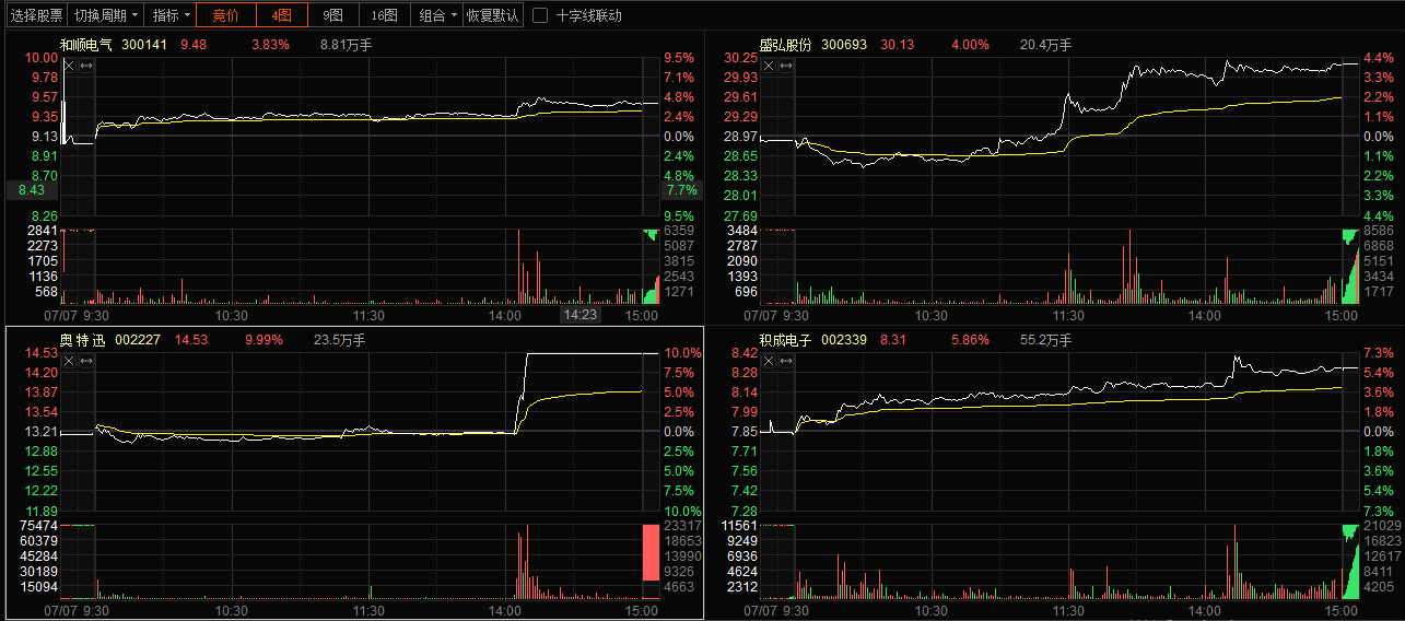 《科创板日报》7月7日讯(编辑 宋子乔) 今日充电桩概念走强,奥特迅直线涨停,永贵电器、积成电子、英可瑞、盛弘股份、和顺电气等快速跟涨。