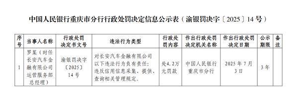 同时,央行重庆市分行对时任长安汽金运营服务部征信管理岗工作人员李某达处4.1万元罚款,对时任长安汽金运营服务部总经理罗某处4.2万元罚款,对时任长安汽金运营服务部征信管理岗工作人员王某娇处4.1万元罚款。以下是相关行政处罚决定信息公示表正文: