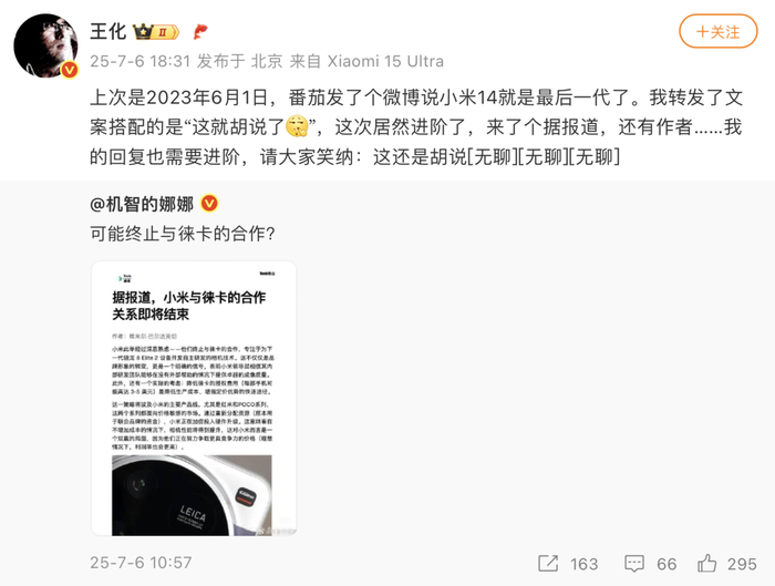 王化表示,2023年6月1日,番茄曾发微博说小米14就是最后一代了。当时他转发了文案搭配的是“这就胡说了”。针对最新的小米与徕卡的相关报道,其又回复称“这还是胡说”。