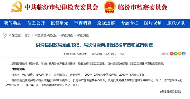 2023年9月1日,付雪海涉嫌严重违纪违法,经临汾市纪委监委指定,接受安泽县纪委监委纪律审查和监察调查。网络截图