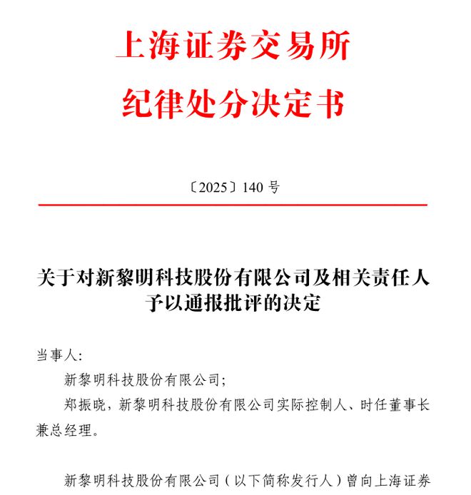基于此,上交所对新黎明及实控人郑振晓予以通报批评。