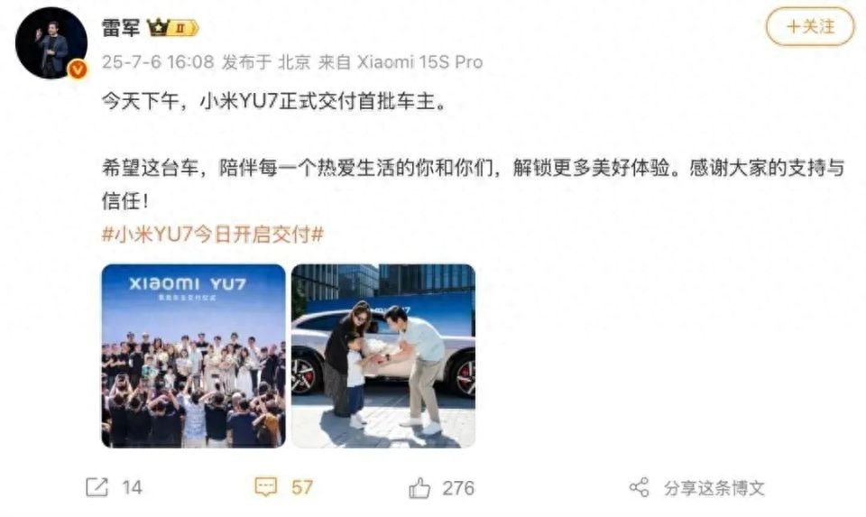 雷军发文称小米YU7今日交付(来源:雷军微博)
