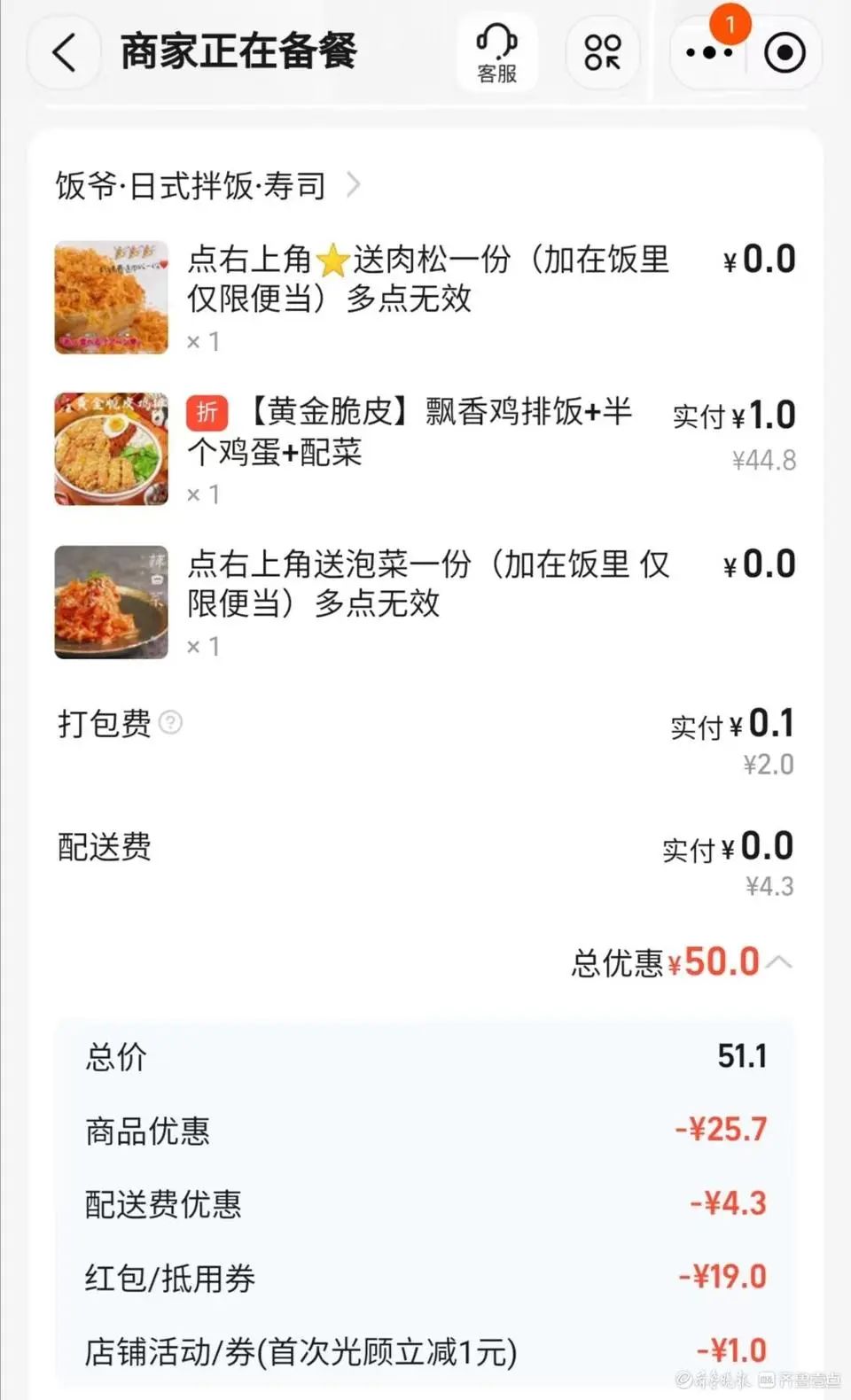 济南市民张先生也参与到了这场“外卖大战”当中,作为淘宝闪购的新用户,平台补贴和新人优惠叠加之后,一份原价51.1元的鸡排套餐只花了1.1元。不过这样的外卖大战对于不急用餐的消费者来说是薅羊毛的福利,但对于急需就餐的顾客却是一场“灾难”。小杰从潍坊来济南出差,下午两点时从潍坊出发在高铁上提前点好的晚餐,六点到济南时还没收到。“没办法,晚上7点的活动,只能饿着肚子晚点再说了。”也有不少网友表示,美团平台一崩,自己的外卖券也失效了,联系客服处理都要“排队”。