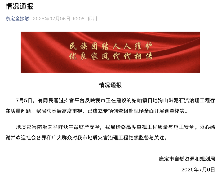 7月6日,四川康定市自然资源和规划局通报:7月5日,有网民通过抖音平台反映我市正在建设的姑咱镇日地沟山洪泥石流治理工程存在质量问题。我局获悉后高度重视,已成立专项调查组赴现场全面开展调查核实。