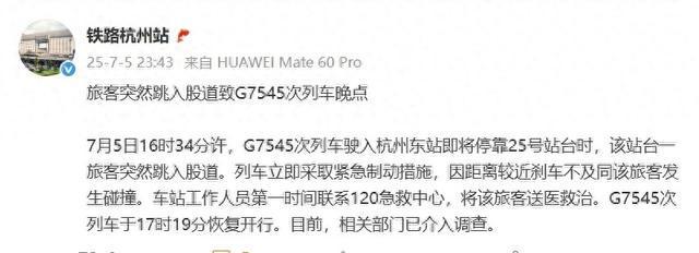 7月5日16时34分许,G7545次列车驶入杭州东站即将停靠25号站台时,该站台一旅客突然跳入股道。列车立即采取紧急制动措施,因距离较近刹车不及同该旅客发生碰撞。车站工作人员第一时间联系120急救中心,将该旅客送医救治。G7545次列车于17时19分恢复开行。目前,相关部门已介入调查。