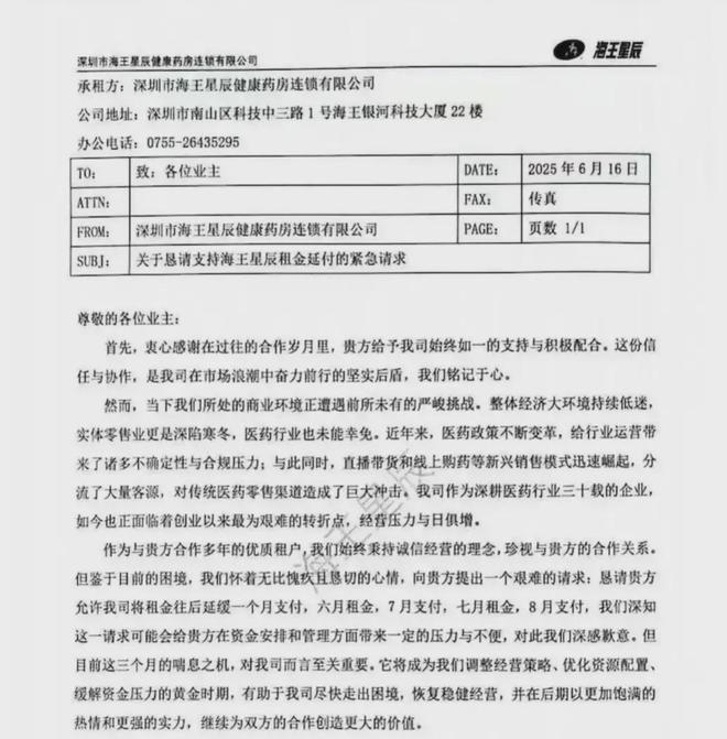 为此,海王星辰希望将租金往后延缓一个月支付,也就是6月租金,7月支付;7月租金,8月支付。同时还强调:“目前这三个月的喘息之机,对我司而言至关重要。它将成为我们调整经营策略、优化资源配置、缓解资金压力的黄金时期,有助于我司尽快走出困境,恢复稳健经营,并在后期以更加饱满的热情和更强的实力,继续为双方的合作创造更大的价值。”