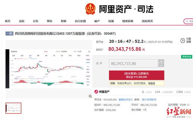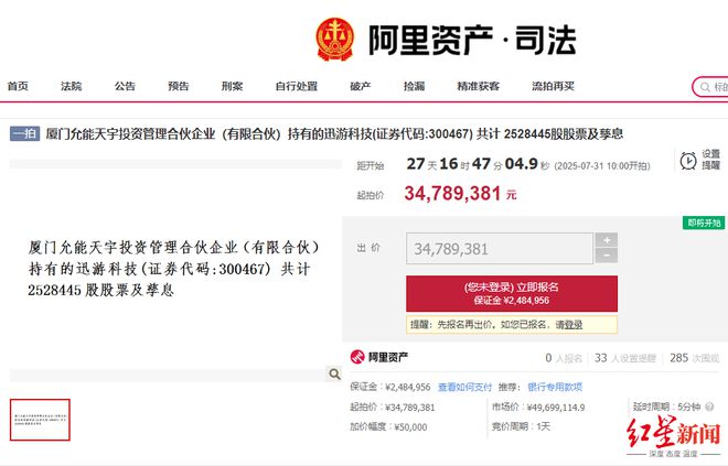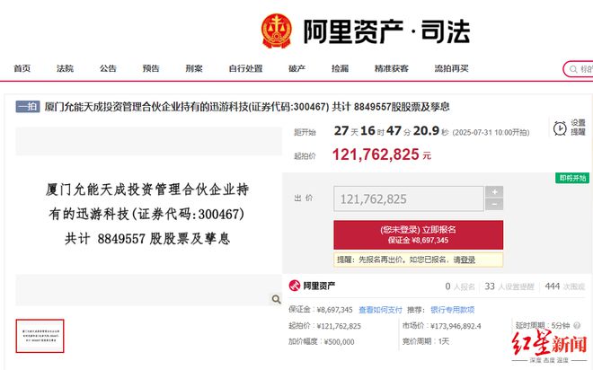 7月1日,迅游科技(300467.SZ)发布公告,公司合计持股5%以上股东厦门允能天成投资管理合伙企业(有限合伙)和厦门允能天宇投资管理合伙企业(有限合伙)所持公司全部股份将被四川省成都市中级人民法院在淘宝司法拍卖网络平台公开拍卖。