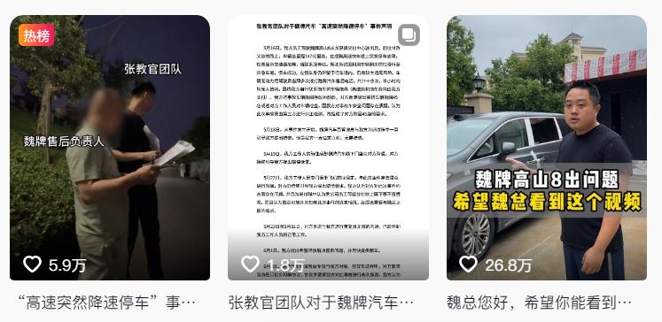7 月 4 日消息,抖音拥有超 700 万粉丝的网红“张教官的有趣人生”7 月 2 日发布视频称,长城汽车旗下魏牌高山 8 汽车从交付中心出来上高速仅仅行驶 100 多公里后,突然降速停车,仪表显示变速器故障。