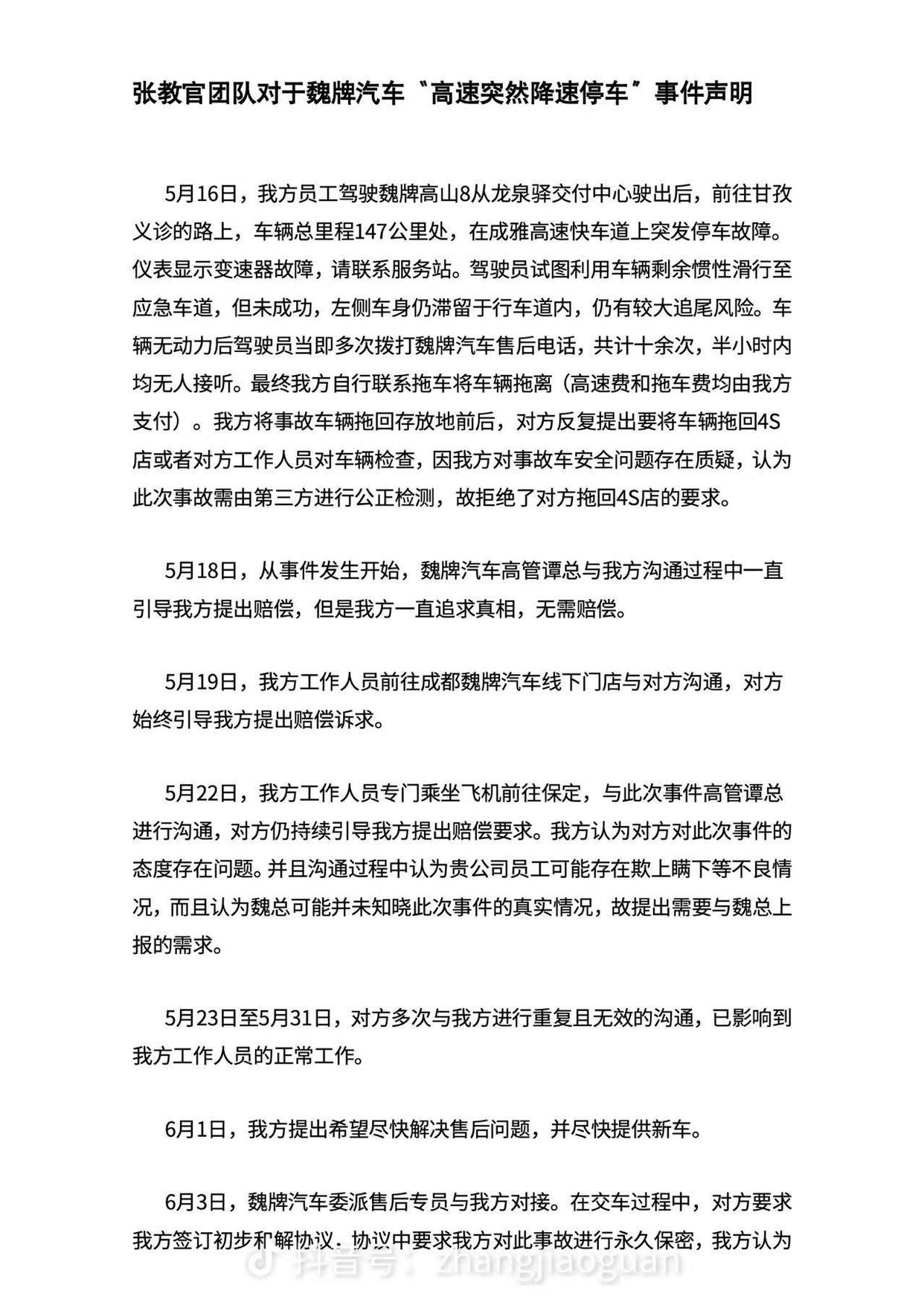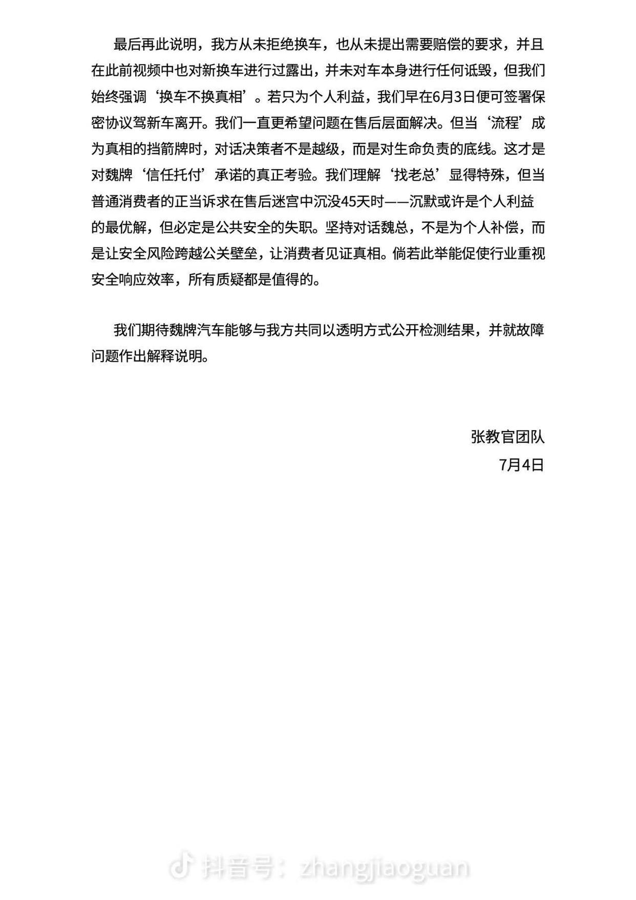 魏牌公告最后表示:“期待张教官能够与我们共同公开透明的就产品和服务问题进行充分沟通,并且我们接受第三方检测机构的故障检测和评定。我们将以最大的诚意、最严谨的态度推进事件调查,感谢各位用户及社会各界朋友的关注!”