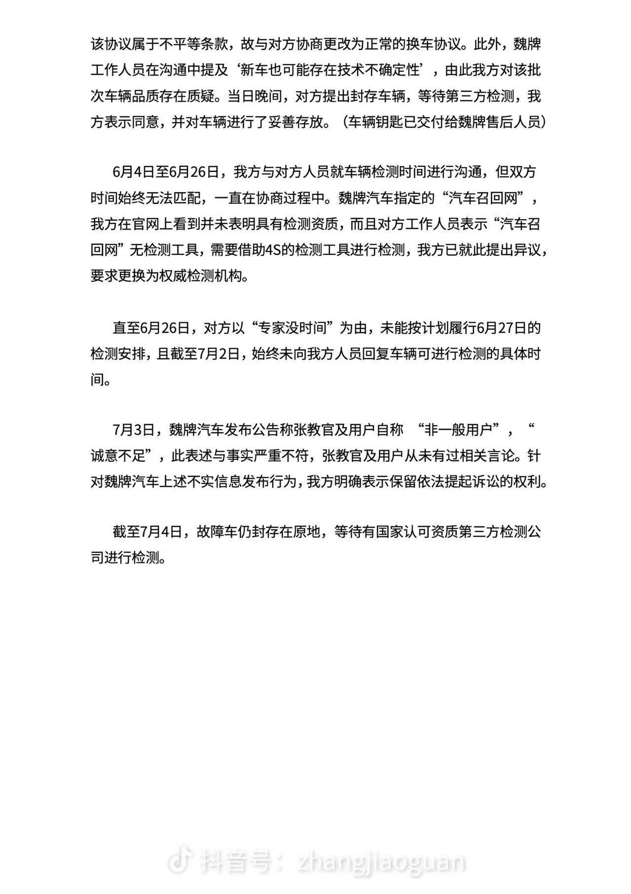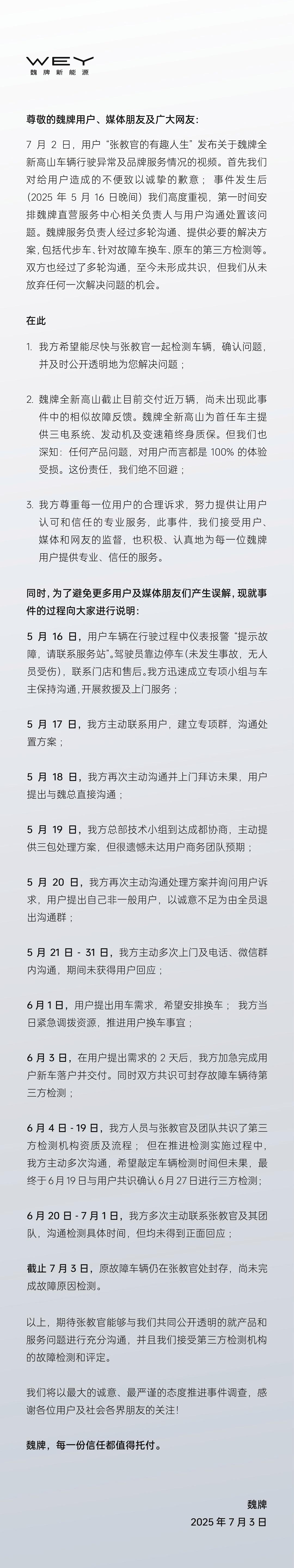 对此,魏牌官方 7 月 3 日发布公告称,该事件发生于 5 月 16 日晚,已第一时间安排魏牌直营服务中心相关负责人与用户沟通处置该问题,双方也经过了多轮沟通,至今未形成共识。
