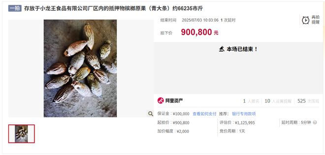 红星资本局注意到,小龙王公司旗下有多批次的槟榔原果在阿里资产·司法平台上拍卖,但几乎无人报名导致流拍。此次拍卖,竞买号为“P8904”的买家以底价90.08万元拍下。