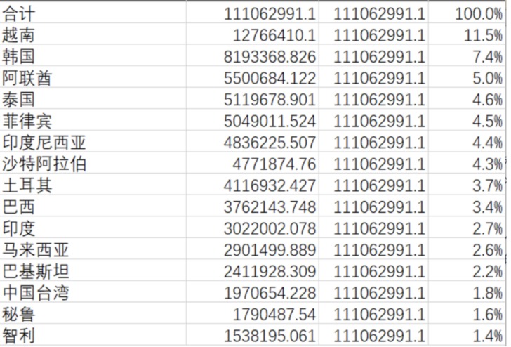 这其中,越南就位列中国出口钢铁产品的第一大目的地,2024年中国对越南的钢铁出口占比11.5%,第二名的韩国则占7.4%。
