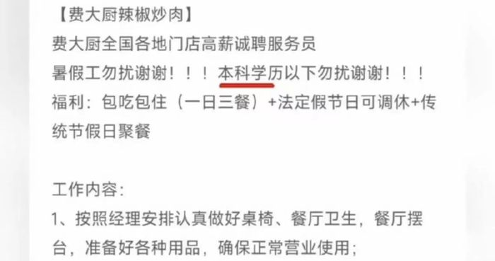 该事件起因是,近日有网友发帖称,费大厨辣椒炒肉一门店招聘服务员,月薪五千到六千元,要求“本科学历以下勿扰”。工作内容为做好餐厅桌椅相关卫生清洁工作,并在接待顾客时主动热情。
