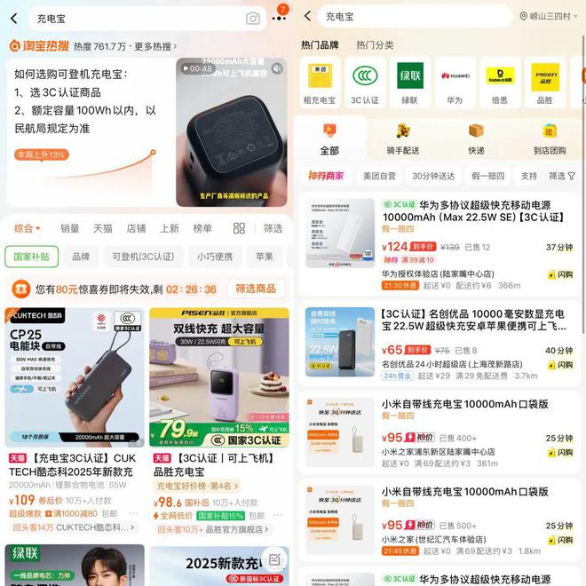 记者观察到,为响应消费者需求并消除顾虑,各大充电宝企业及电商平台已积极行动。目前,在淘宝、京东、拼多多、美团等平台搜索“充电宝”时,品胜、小米、绿联、倍思、安克创新等品牌均在商品文字与图片介绍中新增“3C认证”“新国标3C认证”“国家3C认证”“可上飞机高铁”等信息。此外,各大平台还为消费者优化了筛选功能:淘宝、美团设置了“可登机”“3C认证”等筛选选项,淘宝热搜与京东热搜也推出“选购充电宝指南”,提醒用户优先选择具备3C认证且额定容量在100Wh以内的产品。
