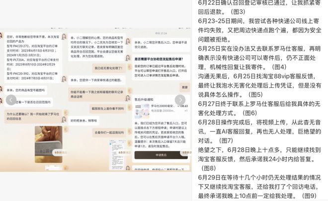 一位消费者的经历颇具代表性:6月21日,他在看到召回公告后立即联系淘宝旗舰店客服并提交召回申请,次日审核通过;但随后数日,快递公司始终未上门揽收充电宝。6月25日,他再次联系罗马仕客服,仅得到“请自行寄件”的机械性回复。沟通无果后,他转向淘宝88VIP客服寻求帮助,最终被建议对产品进行无害化处理。然而,在按要求上传处理视频后,他又陷入“无法接通罗马仕人工客服申请退款”的困境。直至6月29日,淘宝客服介入开通退款通道,并承诺“24小时内商家未处理将自动退款”,但6月30日他却收到罗马仕的拒绝通知,理由是“产品超过质保期”。