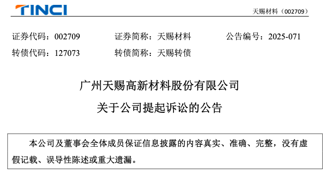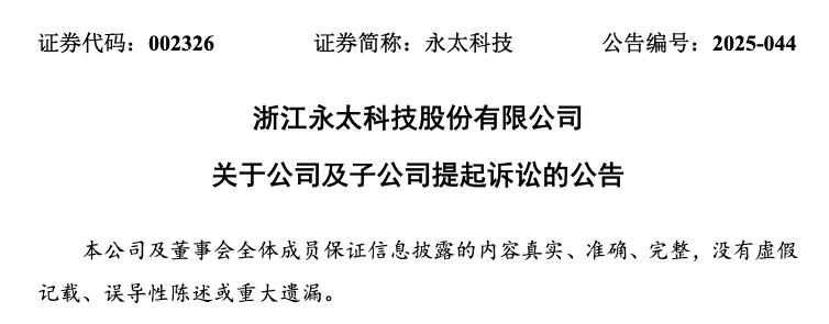 时隔一天,永太科技(002326)7月3日晚间发布公告称,公司及控股子公司邵武永太高新材料有限公司(以下简称“永太高新”) 就天赐材料侵害公司及控股子公司名誉权的行为分别向临海市人民法院和邵武市人民法院提起民事诉讼,临海市人民法院和邵武市人民法院已于2025年7月3日立案受理。