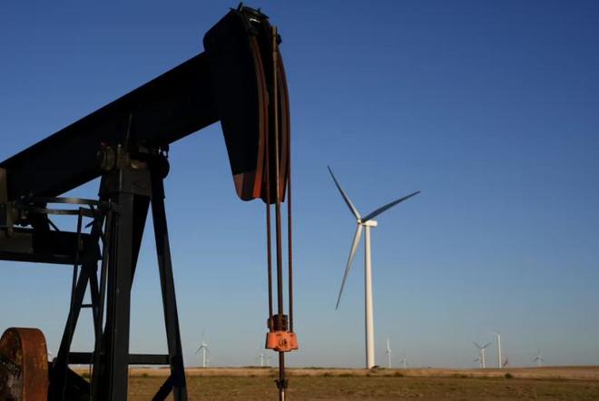 美国堪萨斯州一处油井附近设立风力发电机。 (视觉中国)