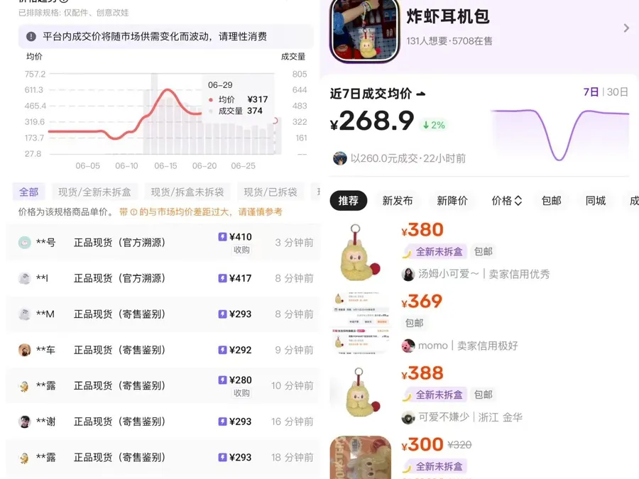 又如,网上流传着一张原价99元Labubu耳机包以1000多元“成交”的截屏图。但细看可见,1000多元是卖家出价,而非成交价。多个二手交易平台数据显示,对应产品的实际成交价在300元左右,价格还在下滑。