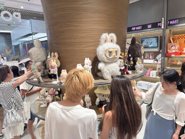 泡泡玛特线下门店“只看不卖”的Labubu搪胶玩偶依旧吸引了很多消费者。
