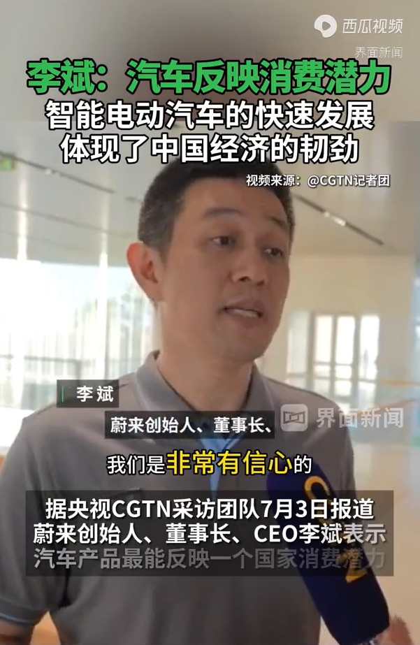 据中央广播电视总台CGTN采访团队7月3日报道,蔚来创始人、董事长、CEO李斌表示,汽车产品最能反映一个国家消费潜力,近年来中国汽车销量稳中有升,其中智能电动汽车的发展是中国新能源产业和信息技术产业快速发展的缩影,是中国经济充满韧劲的体现;对于未来的汽车消费市场,他非常有信心。