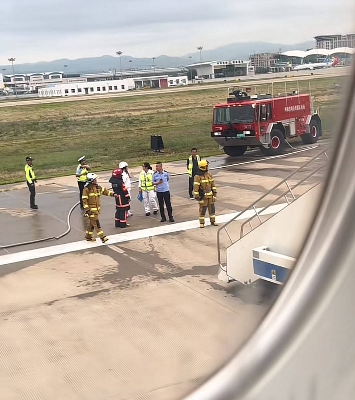 网友称飞机紧急刹停后消防公安救护赶到现场疏散乘客。网络截图。
