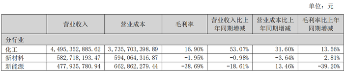 但从各个业务板块看,去年百川股份只有化工业务营收实现了53.07%的增长,新材料和新能源业务营收均呈现不同幅度的下滑。