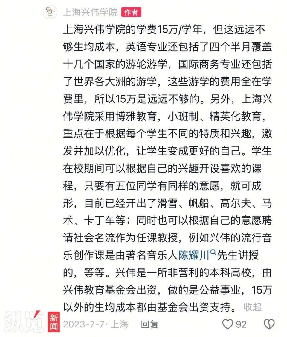 上海兴伟学院曾在官方账号解释学费包含内容。(来源/上海兴伟学院官方抖音号)