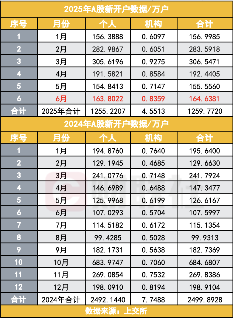 2025年6月,A股市场新开户数达165万户,环比上月有所回升,2025年上半年已累计新开1260万户。