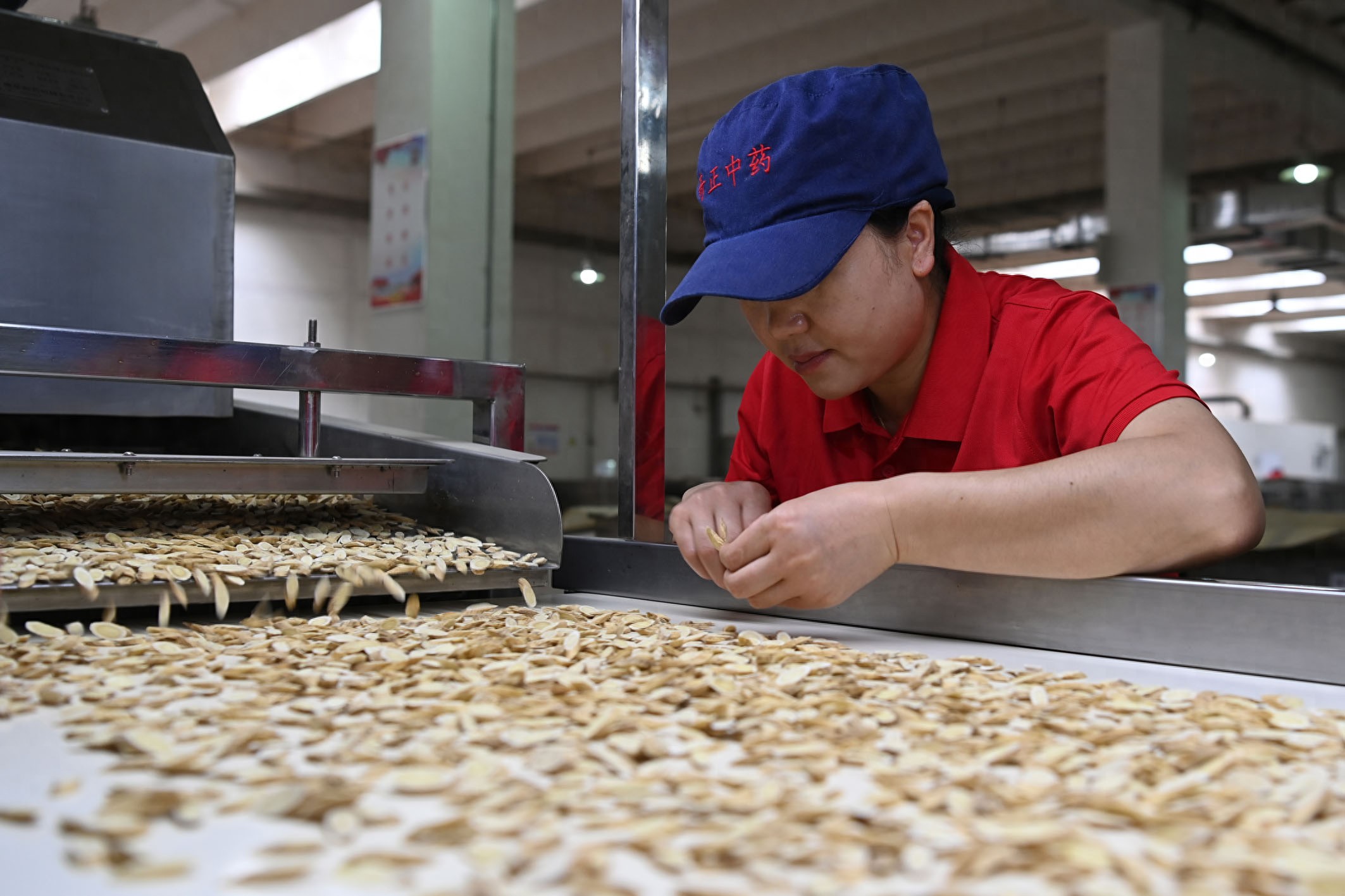 在甘肃陇西县文峰镇一家药材企业,工人在中药材切片生产线上忙碌。资料照片