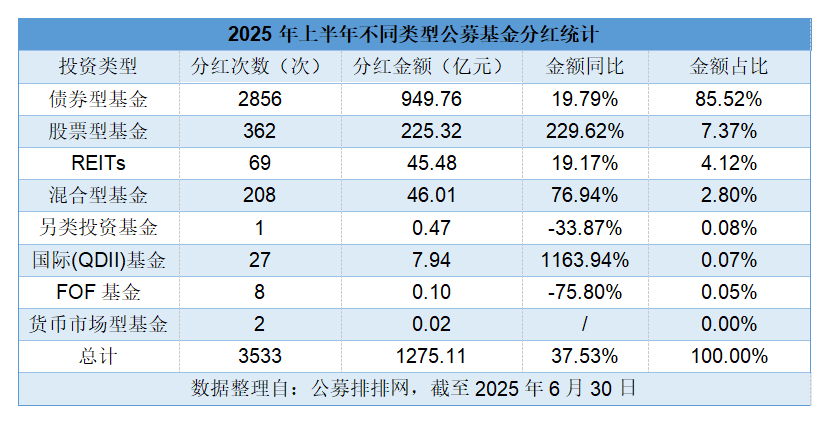 公募排排网数据显示,截至2025年6月30日,上半年公募基金共计分红3533次,分红金额达1275.11亿元,同比增长37.53%。