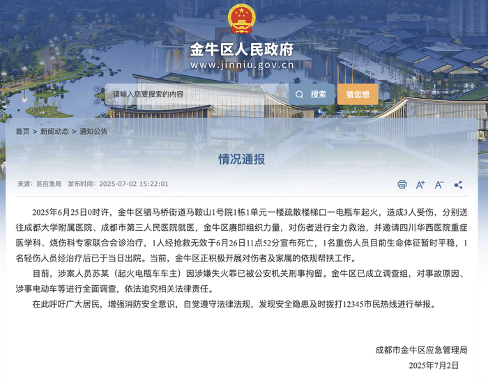 7月2日,成都市金牛区应急管理局通报,2025年6月25日0时许,金牛区驷马桥街道马鞍山1号院1栋1单元一楼疏散楼梯口一电瓶车起火,造成3人受伤,分别送往成都大学附属医院、成都市第三人民医院就医,金牛区赓即组织力量,对伤者进行全力救治,并邀请四川华西医院重症医学科、烧伤科专家联合会诊治疗,1人经抢救无效于6月26日11点52分宣布死亡,1名重伤人员目前生命体征暂时平稳,1名轻伤人员经治疗后已于当日出院。当前,金牛区正积极开展对伤者及家属的依规帮扶工作。