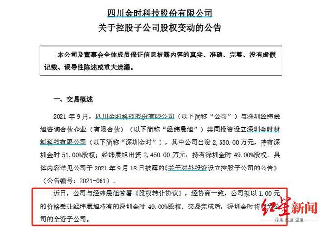 7月1日,金时科技(002951.SZ)发布公告,公司与经纬晨旭签署《股权转让协议》,经协商一致,拟以1元的价格受让经纬晨旭持有的深圳金时材料科技有限公司(简称“深圳金时”)49.00%股权。
