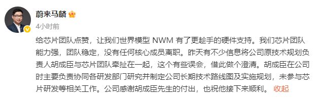 7月2日,蔚来品牌与传播助理副总裁马麟发文表示:“我们芯片团队能力强,团队稳定,没有任何核心成员离职。昨天有不少信息将公司原技术规划负责人胡成臣与芯片团队牵扯在一起,这个有些误会,借此做个澄清。胡成臣在公司时主要负责协同各研发部门研究并制定公司长期技术路线图及实施规划,未参与芯片研发等相关工作。”