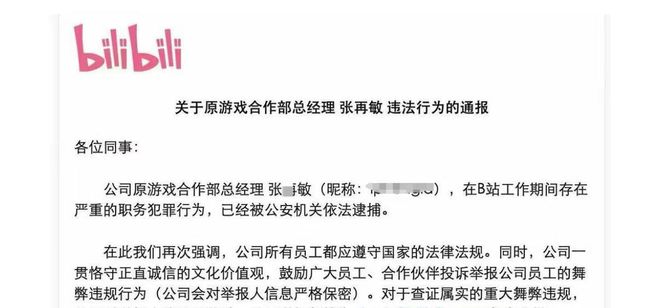 7月2日,红星资本局从多个渠道获悉,今日,B站发布一封内部邮件,通报公司原游戏合作部总经理张某敏的违法行为,称其在B站工作期间存在严重的职务犯罪行为,并表示该人员已经被公安机关依法逮捕。