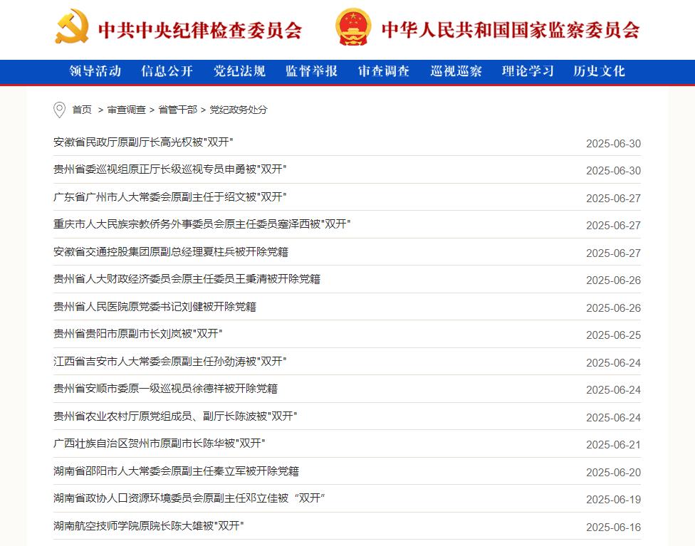 此外还有:安徽省民政厅原党组成员、副厅长高光权被开除党籍和公职,广东省广州市人大常委会原党组成员、副主任于绍文被开除党籍和公职,湖南航空技师学院原党委副书记、院长陈大雄被开除党籍和公职,中国建设银行安徽省分行原党委委员、副行长范绍杰被开除党籍,中国远洋海运原党组管理正职领导干部隋军被开除党��和公职,中国电信四川公司原党委书记、总经理郑成渝被开除党籍和公职,等等。