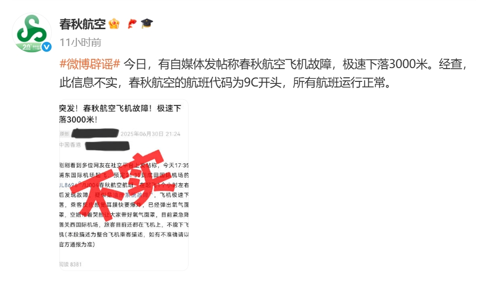 6月30日晚,春秋航空官方微博发文称,有自媒体发帖称春秋航空飞机故障,极速下落3000米。经查,此信息不实,春秋航空的航班代码为9C开头,所有航班运行正常。