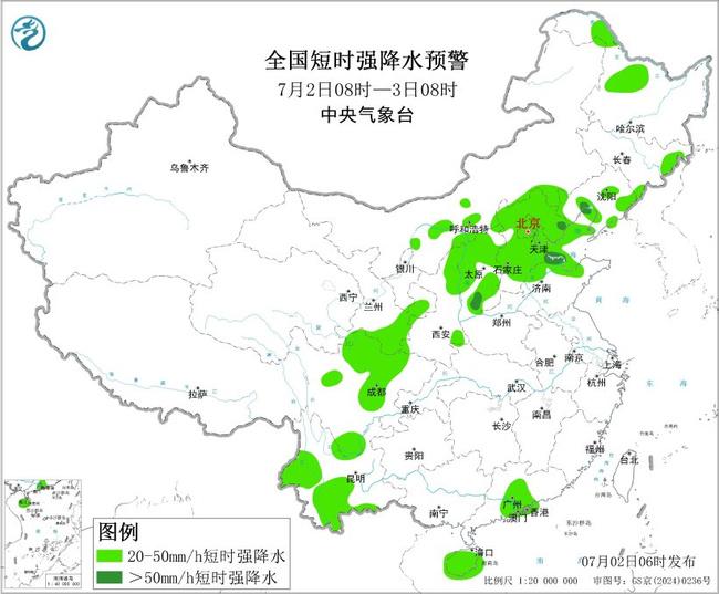 预计7月2日08时至3日08时,东北地区、华北东部等地的部分地区将有8级以上雷暴大风或冰雹天气,其中,黑龙江中西部等地的部分地区将有10级以上雷暴大风,最大风力可达11级以上,黑龙江中西部等地的局地可能出现龙卷天气;东北地区北部和东南部、华北、黄淮北部、西南地区东部、华南南部等地的部分地区将有小时雨量大于20毫米的短时强降水天气,其中,辽宁中西部、山西南部、河北东部、山东北部等地的部分地区小时雨量大于50毫米,最大可达70毫米以上。