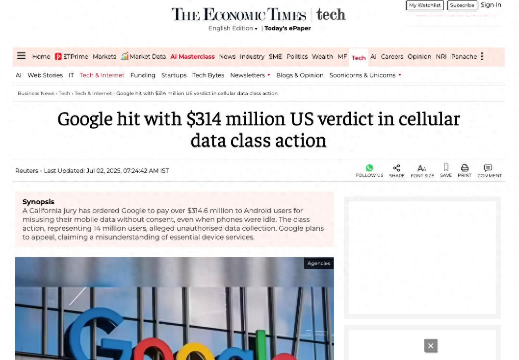 本案原告为加州安卓用户代表团体,指控谷歌自2014年起在安卓系统(包括原生系统及定制ROM)中植入隐蔽机制:即使用户未主动使用任何谷歌服务(如搜索、地图或YouTube),设备仍会持续向谷歌服务器发送包括设备标识符、地理位置、应用使用习惯等敏感信息。陪审团认定,这种行为构成“未经用户有效同意的数据窃取”,且用户无法通过常规设置彻底关闭数据传输。