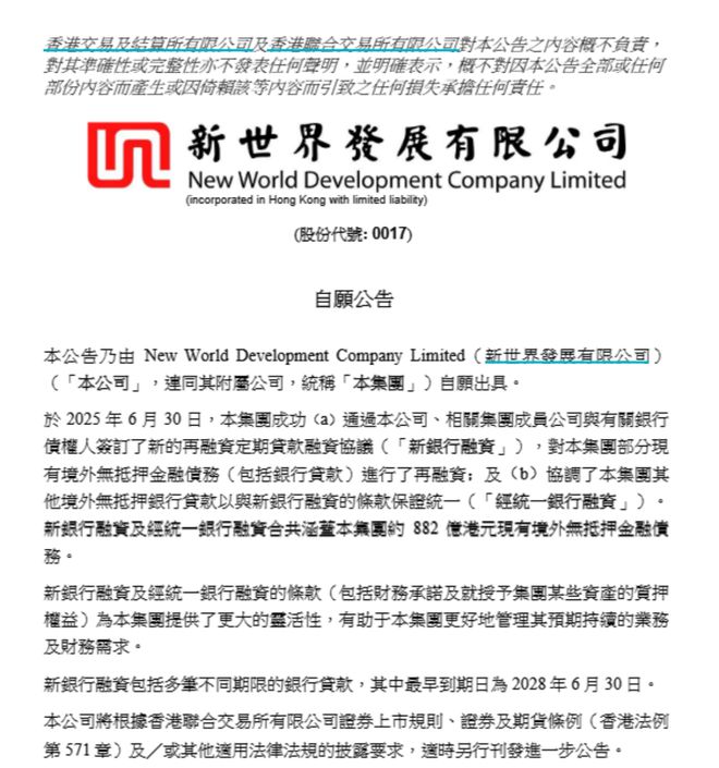 6月30日,新世界发展宣布,集团(新世界发展连同其附属公司)成功通过本公司、相关集团成员公司与有关银行债权人签订了新的再融资定期贷款融资协议(下称“新银行融资”),对集团部分现有境外无抵押金融债务(包括银行贷款)进行了再融资;并协调了集团其他境外无抵押银行贷款以与新银行融资的条款保证统一(下称“经统一银行融资协议”)。