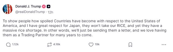 据报道,特朗普当天在社交媒体上发文说,“我对日本怀有极大的敬意,他们却不愿进口我们的大米,而他们自己正面临严重的米荒。换句话说,我们只需要发一封信(就能解决)。我们愿在未来多年里让他们继续做贸易伙伴。”